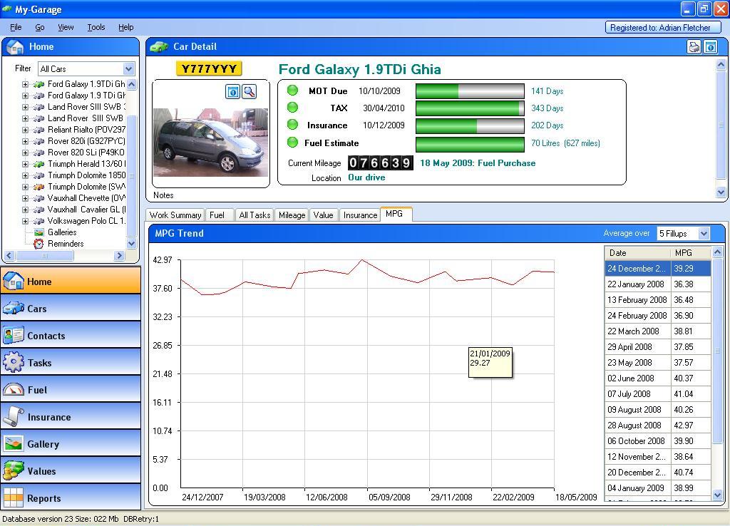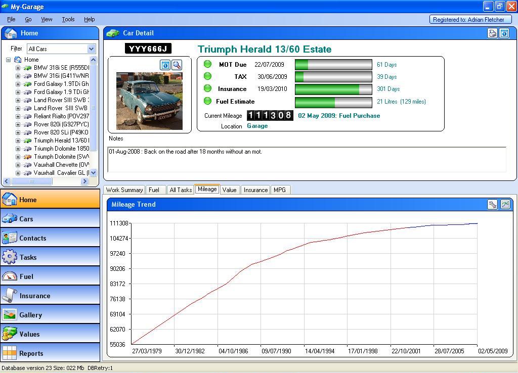Car DetailsClick on a car in the tree view to display the main care details. This shows bar charts for remaining MOT / TAX / Insurance, and an estimate of fuel in the tank.