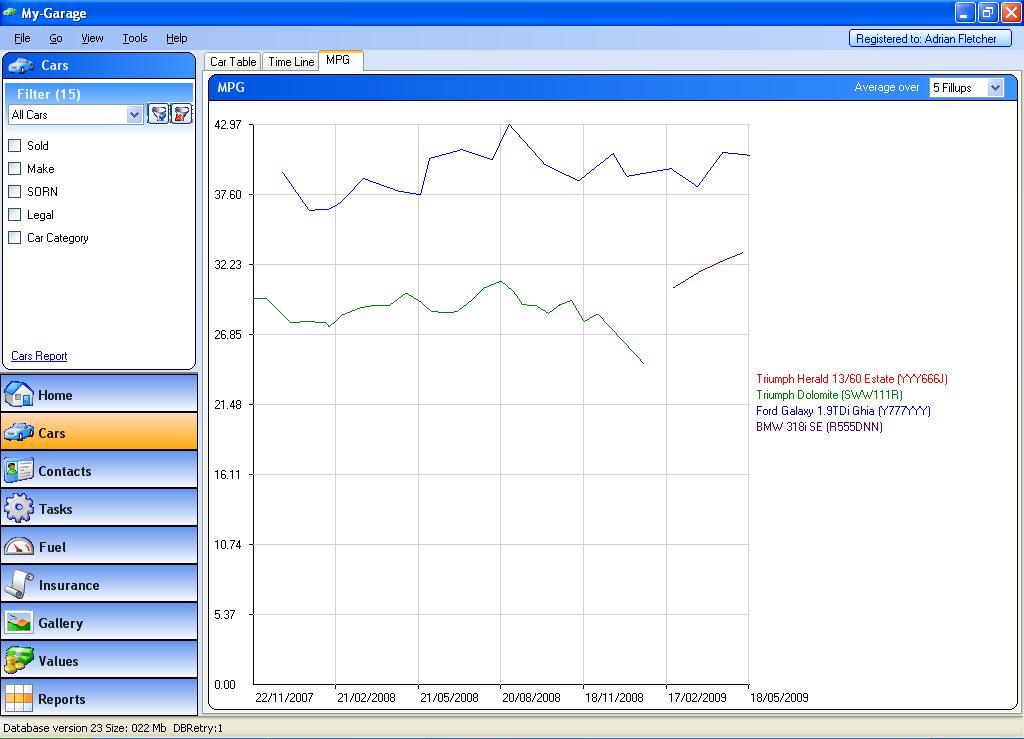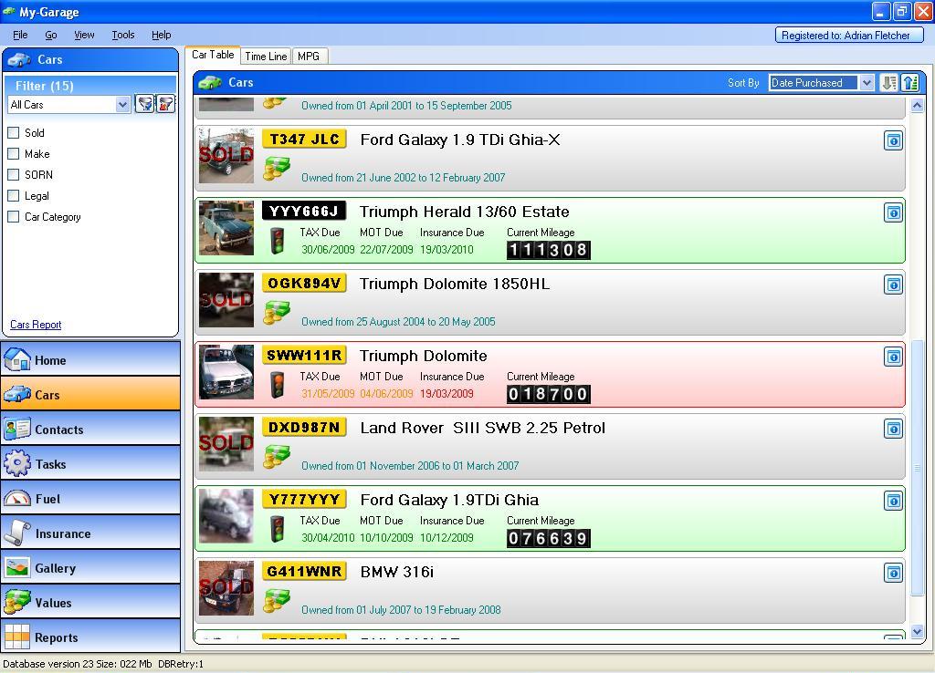 Time LineDisplay a time line for each of your cars. This will show when it was built, when it was registered, when you bought it, when you sold it, and when it was scrapped.
