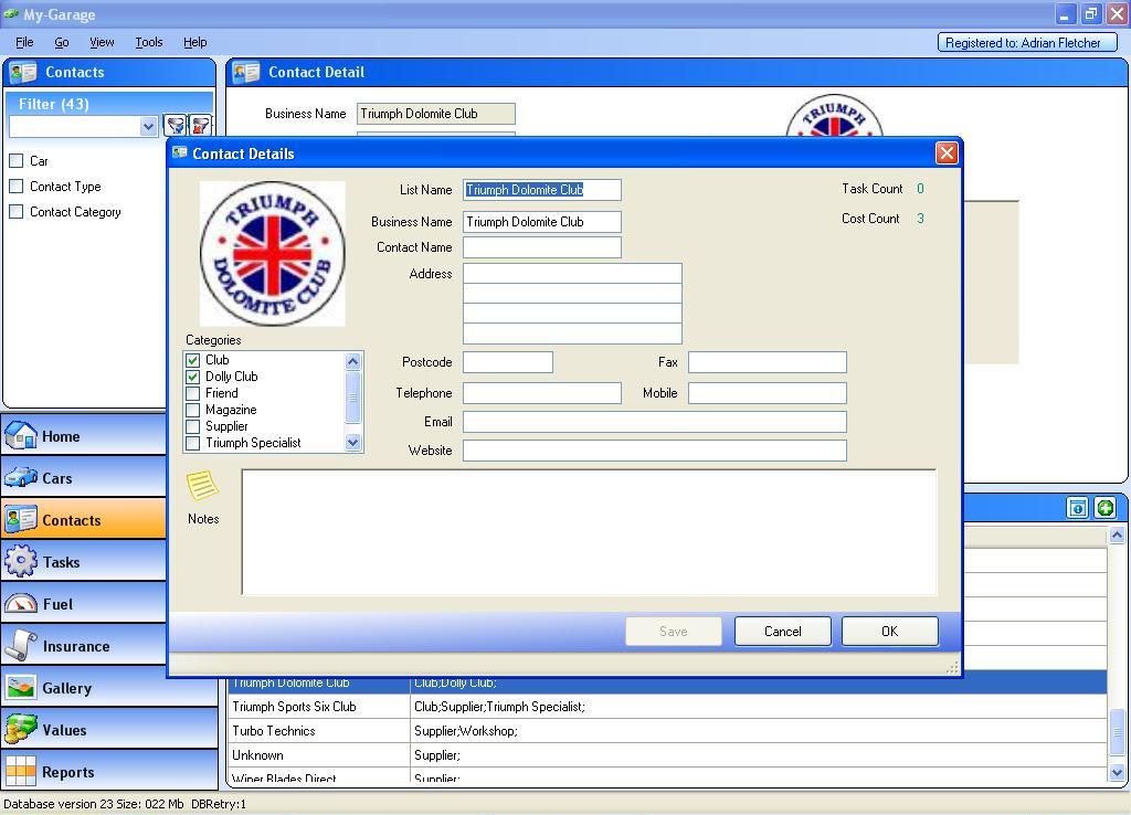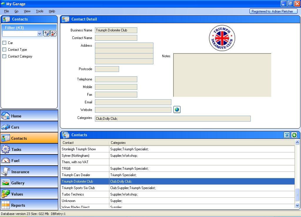 ContactsContacts Suppliers, insurance companies, workshops etc are all contacts. Store them all here for eacy reference. Use the searh filter to find all "contacts" that have supplied / worked on a particular car.
