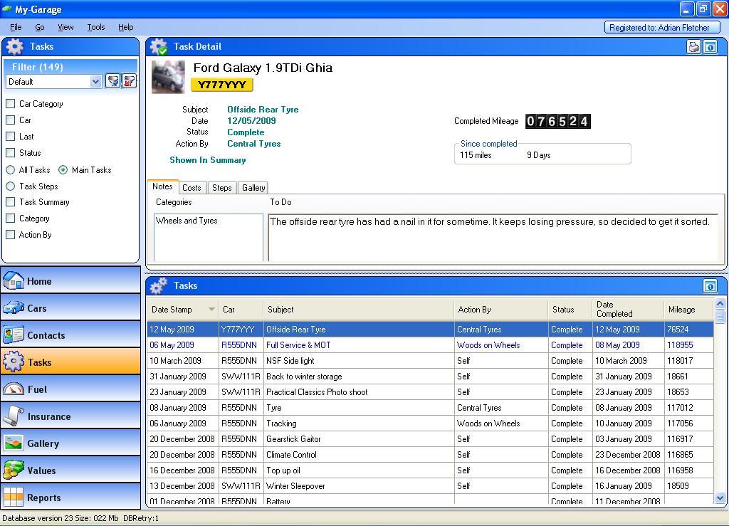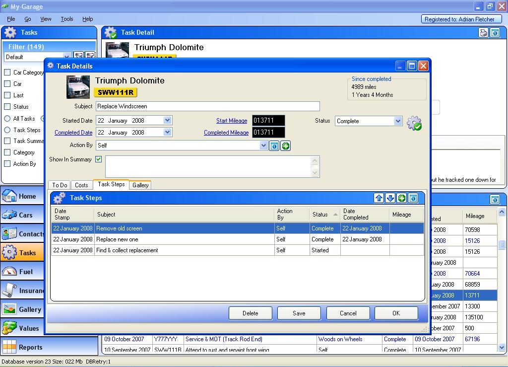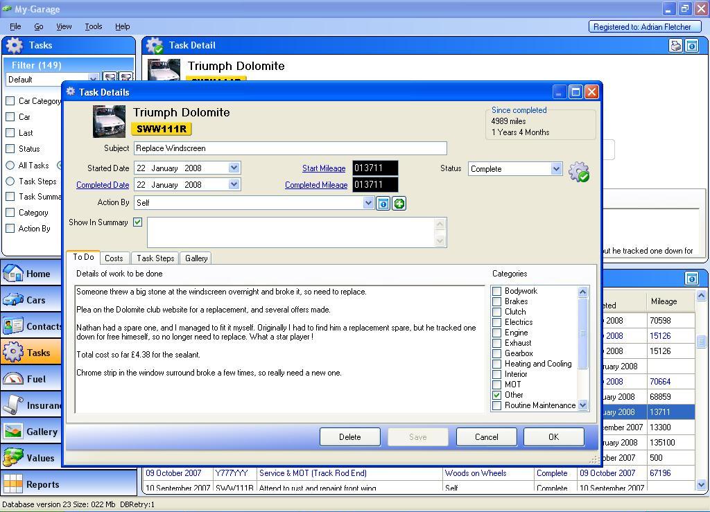 Task EditingA history file is built up using a number of tasks. Each task will have dates and mileage associated with it. You can then add costs to the task, and add a gallery of pictures. Large tasks can be split into sub-tasks.