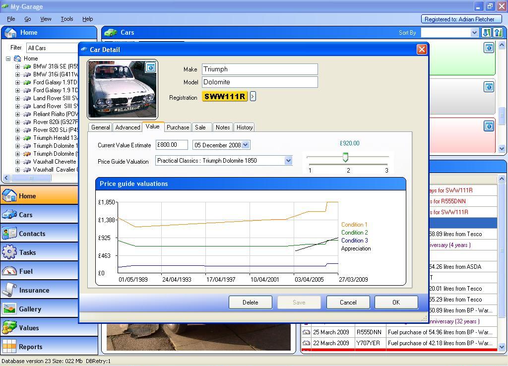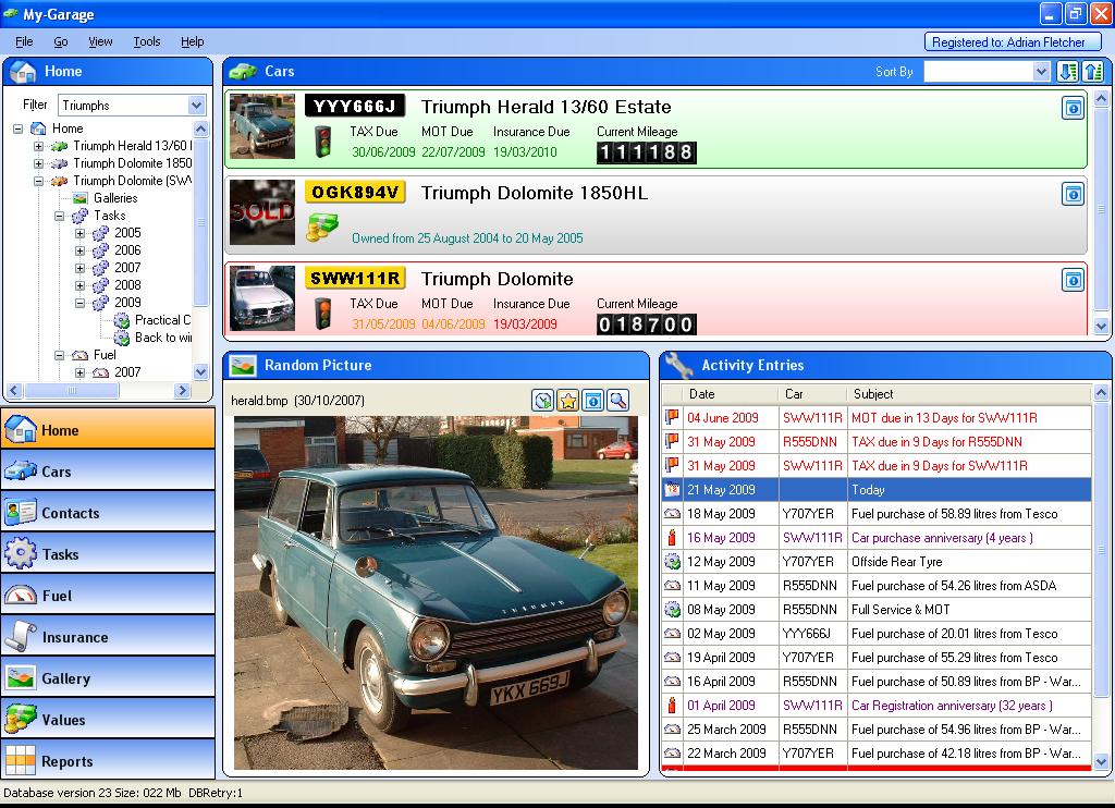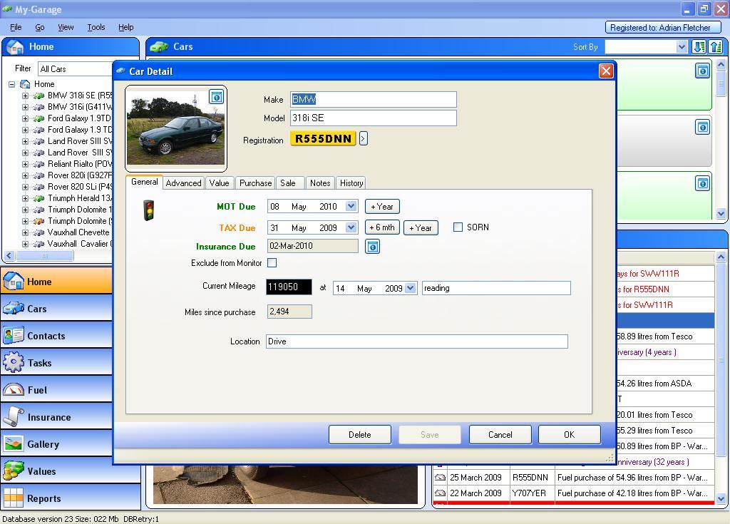 Home PageThe home page gives you at-a-glance information about your cars. The tree view allows easy navigation through cars / tasks / fuel purchases and picture galleries.
